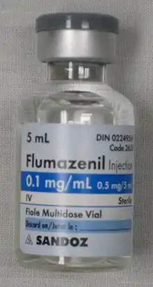 Flumazenil, sold under the brand name Anexate, is a medication used to reverse the effects of benzodiazepines.[1] Routine use is not recommended in those with a decreased level of consciousness.[4] It is given by injection into a vein.[1] Effects begin within 2 minutes and may last for up to 90 minutes.[2][3]