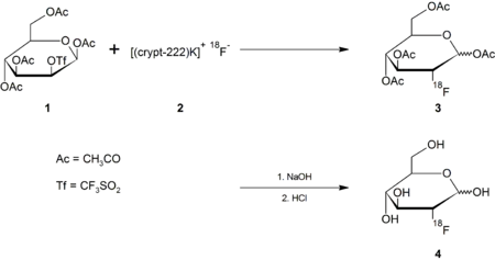 Intermediate 2 is treated with the protected mannose triflate (1); the fluoride anion displaces the triflate leaving group in an SN2 reaction, giving the protected fluorinated deoxyglucose (3). Base hydrolysis removes the acetyl protecting groups, giving the desired product (4) after removing the cryptand via ion-exchange:[9][10]