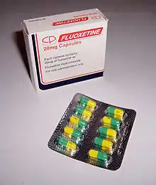 - ↑ Benfield P, Heel RC, Lewis SP (December 1986). "Fluoxetine. A review of its pharmacodynamic and pharmacokinetic properties, and therapeutic efficacy in depressive illness". Drugs. 32 (6): 481–508. doi:10.2165/00003495-198632060-00002. PMID 2878798.