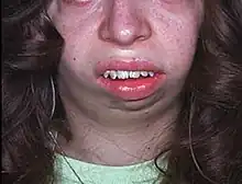 Franceschetti–Klein syndrome (also known as "mandibulofacial dysostosis")[1] is a syndrome that includes palpebral antimongoloid fissures, hypoplasia of the facial bones, macrostomia, vaulted palate, malformations of both the external and internal ear, buccal-auricular fistula, abnormal development of the neck with stretching of the cheeks, accessory facial fissures, and skeletal deformities.[2]: 577 It is sometimes equated with Treacher Collins syndrome.[3]