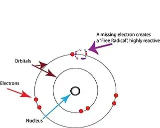 The free radical theory of aging states that organisms age because cells accumulate free radical damage over time.[1] A free radical is any atom or molecule that has a single unpaired electron in an outer shell.[2] While a few free radicals such as melanin are not chemically reactive, most biologically relevant free radicals are highly reactive.[3] For most biological structures, free radical damage is closely associated with oxidative damage. Antioxidants are reducing agents, and limit oxidative damage to biological structures by passivating them from free radicals.[4]