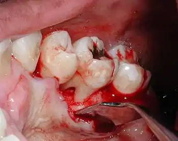 In dentistry, a furcation defect is bone loss, usually a result of periodontal disease, affecting the base of the root trunk of a tooth where two or more roots meet (bifurcation or trifurcation). The extent and configuration of the defect are factors in both diagnosis and treatment planning.[1]