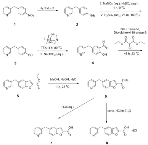 Furegrelate is a synthetic compound that cannot be synthesised by the human body. Several pathways were proposed for the synthesis of Furegrelate sodium salt and related compounds by Johnson et al. and is presented in Figure 1.[2] The nitro group of the starting material, 3-(4-nitrobenzyl)pyridine (1), is reduced using hydrogen over palladium on activated carbon to form 3-(4-aminobenzyl)pyridine (2). In the following step, nitric acid was created in situ by mixing sodium nitrite with sulphuric acid in ice-cold water. The nitric acid attaches to the amino group, forming a diazo group. The hydroxyl group is obtained by stirring the diazo intermediate in a hot aqueous sulphuric acid solution, giving product 3. Product 3 was formylated on the ortho-position relative to the hydroxyl group, using an adjusted Duff reaction using hexamine and trifluoroacetic acid (TFA). In the Duff reaction, the formyl carbon is created from hexamine, leading to product 3-(3-hydroxy-4-formylbenzyl)pyridine, 4. Benzofuran-2-carboxylic acid ethyl ester (5), was obtained using a base-promoted reaction with diethyl bromomalonate and sodium hydride on product 4. To increase NaH solubility, a crown ether was used. Ester product 5 was then transformed to Furegrelate sodium salt 6 using methanol and sodium hydroxide in water. Johnson and co-workers synthesised also two other Furegrelate chemical forms: the free-base 7 and hydrochloric acid salt 8 forms.