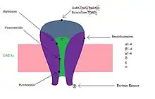The GABAA receptors are made up of subunits which form a receptor complex. Humans have 19 receptor subunits and are classified into α (1–6), β (1–3), γ (1–3), δ, ε, π, θ, and ρ (1−3). The function of the receptor is different according to how the pentameric complex is put together. The most common complex that includes around 40% of the GABAA receptors is the α1β2γ2 combination. The expression of the subunits can be very different depending on brain region.[7] The combination of the subunits influences how the receptor acts. For example, if the α1 and β2 subunits are expressed together they have high sensitivity to GABA, but low channel conductance. But if the γ2 is expressed with α1 and β2 the sensitivity is low and channel conductance is high.[8] γ2 subunit has to be present for high affinity binding of benzodiazepine. Little is known about where different complexes are located in the brain, complicating drug discovery.[7] For example, the binding site of neurosteroids in the GABAA receptor is not known[9] and barbiturates bind at a beta subunit that is distinct from the benzodiazepine binding site.