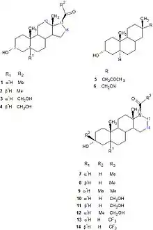 33. Covey DF, Han M, Kumar AS, de La Cruz MA, Meadows ES, Hu Y, Tonnies A, Nathan D, Coleman M, Benz A, Evers AS, Zorumski CF, Mennerick S (Aug 2000). "Neurosteroid analogues. 8. Structure-activity studies of N-acylated 17a-aza-D-homosteroid analogues of the anesthetic steroids (3alpha, 5alpha)- and (3alpha,5beta)-3-hydroxypregnan-20-one". Journal of Medicinal Chemistry. 43 (17): 3201–4. doi:10.1021/jm0002477. PMID 10966737.