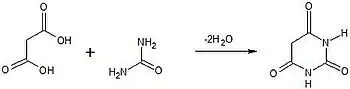 Barbituric acid is the parent compound of barbiturate drugs although barbituric acid itself is not pharmacologically active. Barbiturates were synthesized in 1864 by Adolf von Baeyer by combining urea and malonic acid (Figure 5). A synthesis process was later developed and perfected by French chemist Edouard Grimaux in 1879, making possible the subsequent widespread development of barbiturate derivatives.[25] Malonic acid was later replaced by diethyl malonate, as using the ester avoids the need to deal with the acidity of the carboxylic acid and its unreactive carboxylate (see figure 6). Barbituric acid can form a large variety of barbiturate drugs by using the Knoevenagel condensation reaction.[26]