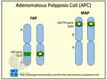 Gardner syndrome is caused by mutation in the adenomatous polyposis coli (APC gene), located in chromosome 5q21 (band q21 on chromosome 5).[3] This gene is also mutant in familial adenomatous polyposis (FAP), a more common disease that also predisposes to colon cancer. Nuances in the understanding of genetics have caused some disorders to be split into multiple entities, while others merged into one genetic condition. After most of the second half of the 20th century, Gardner syndrome has been merged into FAP and is now considered simply a phenotypic subtype of FAP.[8] FAP defined by the development of hundreds or thousands of polyps in the colon. Gardner syndrome is set apart as a subtype because, in addition to colonic polyps, there are also extra-colonic growths (both malignant and benign).[9] There are many terms used to describe "APC-associated polyposis condition" including FAP, attenuated FAP, Gardner syndrome, Turcot syndrome, and gastric adenocarcinoma and proximal polyposis of the stomach (GAPPS). There is a movement toward no longer using the terms Gardner Syndrome or Turcot Syndrome since both are part of the FAP spectrum. Gardner syndrome and Turcot syndrome are regarded primarily for historical interest.[10]