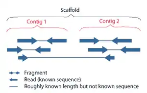 Overlapping reads form contigs; contigs and gaps of known length form scaffolds.