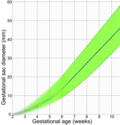 Crown-rump length before a gestational age of 6 weeks is extrapolated by assuming a gestational sac diameter of 0 at a gestational age of 2 weeks, corresponding to a fertilization age of 0 weeks. This extrapolated part is blurred because of uncertain values. - ↑ Gaillard, Frank. "Mean sac diameter | Radiology Reference Article | Radiopaedia.org". Radiopaedia. Retrieved 2 October 2021.