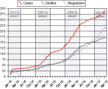 - "Since January 2004, when human cases of H5N1 avian influenza were first reported in the current outbreak, 97 cases and 53 deaths have been reported in Vietnam, Thailand and Cambodia. Vietnam, with 76 cases and 37 deaths, has been the most severely affected country, followed by Thailand, with 17 cases and 12 deaths, and Cambodia, with 4 cases and 4 deaths."[4]