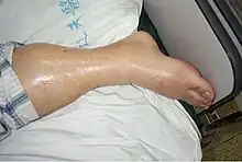 The primary sign of glomerulonephrosis is proteinuria,[2] the loss of greater than 3.5g of protein in one day, and this can cause the urine to be visibly foamy. One key protein lost in proteinuria can be albumin, a crucial transport protein found in plasma.[3] Proteinuria will lead to other symptoms including swelling known as edema, primarily in the legs, and can eventually progress to generalized edema throughout the body in chronic kidney damage, known as anasarca. In primary stages of glomerulonephrosis, edema will be most visible in the feet and ankles, especially for individuals who spend long amounts of time on their feet. This is due to fluid being pulled down within the body by gravity.