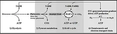 Cells performing aerobic respiration synthesize much more ATP, but not as part of glycolysis. These further aerobic reactions use pyruvate, and NADH + H+ from glycolysis. Eukaryotic aerobic respiration produces approximately 34 additional molecules of ATP for each glucose molecule, however most of these are produced by a mechanism vastly different from the substrate-level phosphorylation in glycolysis.