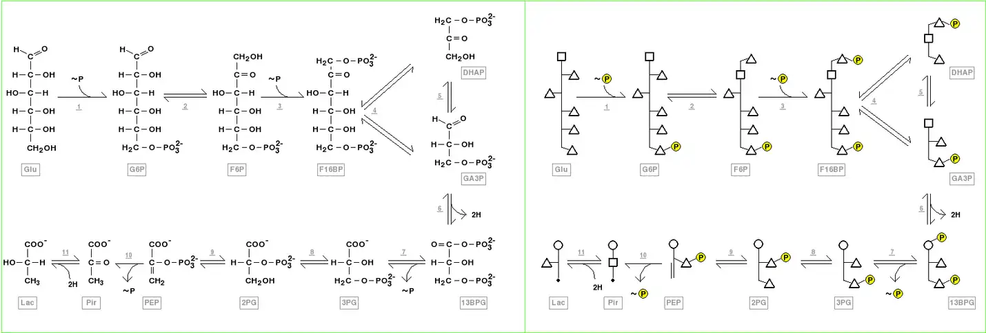 Glycolysis - Structure of anaerobic glycolysis components showed using Fischer projections, left, and polygonal model, right. The compounds correspond to glucose (GLU), glucose 6-phosphate (G6P), fructose 6-phosphate (F6P), fructose 1,6-bisphosphate ( F16BP), dihydroxyacetone phosphate (DHAP), glyceraldehyde 3-phosphate(GA3P), 1,3-bisphosphoglycerate (13BPG), 3-phosphoglycerate (3PG), 2-phosphoglycerate (2PG), phosphoenolpyruvate (PEP), pyruvate (PIR), and lactate (LAC). The enzymes which participate of this pathway are indicated by underlined numbers, and correspond to hexokinase (1), glucose-6-phosphate isomerase (2), phosphofructokinase-1 (3), fructose-bisphosphate aldolase (4), triosephosphate isomerase (5), glyceraldehyde-3-phosphate dehydrogenase (5), phosphoglycerate kinase (7), phosphoglycerate mutase (8), phosphopyruvate hydratase (enolase) (9), pyruvate kinase (10), and lactate dehydrogenase (11). The participant coenzymes (NAD+, NADH + H+, ATP and ADP), inorganic phosphate, H2O and CO2 were omitted in these representations. The phosphorylation reactions from ATP, as well the ADP phosphorylation reactions in later steps of glycolysis are shown as ~P respectively entering or going out the pathway. The oxireduction reactions using NAD+ or NADH are observed as hydrogens “2H” going out or entering the pathway.