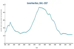 In the United Kingdom, 196 per 100,000 males 20 to 24 years old and 133 per 100,000 females 16 to 19 years old were diagnosed in 2005.[15] In 2013, the CDC estimated that more than 820,000 people in the United States get a new gonorrheal infection each year. Fewer than half of these infections are reported to CDC. In 2011, 321,849 cases of gonorrhea were reported to the CDC. After the implementation of a national gonorrhea control program in the mid-1970s, the national gonorrhea rate declined from 1975 to 1997. After a small increase in 1998, the gonorrhea rate has decreased slightly since 1999. In 2004, the rate of reported gonorrheal infections was 113. 5 per 100,000 persons.[62]