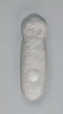 | A live specimen of a septate (or cephaline) gregarine showing the distinctive "head"-like section of the trophozoite containing the epimerite at its anterior end. Septate gregarines are intestinal parasites of arthropods. | |