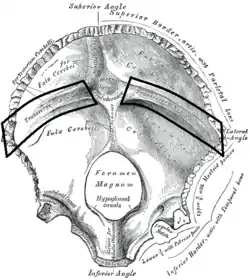 ![]() Human skull (parietal bones removed). Position of groove for transverse sinus shown in red. | |