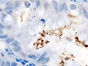 | Immunohistochemical staining of H. pylori (brown) from a gastric biopsy | |
