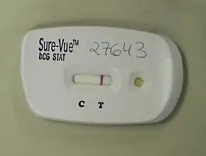 More rare, false negative results can also occur due to a "hook effect", where a sample with a very high level of hCG is tested without dilution, causing an invalid result.[31]