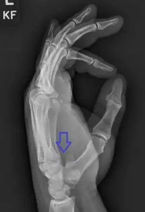 Hamate fracture is a break of the hamate bone in the wrist. Symptoms include pain in the front of the wrist in line with the little finger.[1] It is made worse by gripping an object.[1] Complications may include injury to the ulnar nerve and clotting of the ulnar artery.[1]
