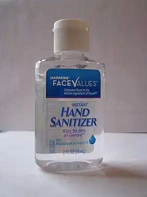 Hand sanitizer is a liquid, gel, or foam generally used to decrease infectious agents on the hands.[3][4] In most settings, hand washing with soap and water is generally preferred.[5][6][7] Hand sanitizer is less effective at killing certain kinds of germs, such as norovirus and Clostridium difficile and unlike soap and water, it cannot remove harmful chemicals.[5] People may incorrectly wipe off hand sanitizer before it has dried,[5] and some are less effective because their alcohol concentrations are too low.[5]