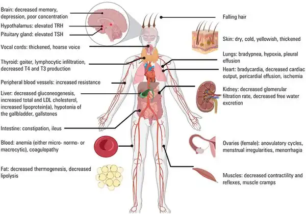 There are many symptoms that are attributed to Hashimoto's thyroiditis or Hashimoto's disease. The most common symptoms include the following: fatigue, weight gain, pale or puffy face, feeling cold, joint and muscle pain, constipation, dry and thinning hair, heavy menstrual flow or irregular periods, depression, panic disorder, a slowed heart rate, and problems getting pregnant and maintaining pregnancy.[12]