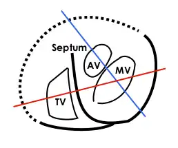 This is further explanation of the echocardiogram above. MV: Mitral valve, TV: Tricuspid valve, AV: Aortic valve, Septum: Interventricular septum. Continuous lines demarcate septum and free wall seen in echocardiogram, dotted line is a suggestion of where the free wall of the right ventricle should be. The red line represents where the upper left loop in the echocardiogram transects the 3D-loop, the blue line represents the lower loop.