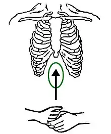 If the person choking should not receive pressures on the abdomen (for example, in case of pregnancy or excessive obesity), chest thrusts are advised instead.[11] These are applied on the lower half of the chest, but not in the very endpoint (which is the xiphoid process). In contrast to the prevailing American and European advice, the Australian Resuscitation Council recommends chest thrusts instead of abdominal thrusts.[12]