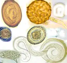 Collage of various helminth eggs, from left to right: Trichosomoides egg, Ascaris lumbricoides with larva hatching, sample of adult roundworms, Hymenolepis nana, Schistosoma mansoni and Toxocara canis with larva hatching