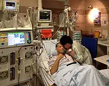 A patient of an intensive care unit in a German hospital in 2015 who had a nearly complete disfunction of the kidneys due to a severe sepsis. The hemodialysis had to be carried out with a portable machine (left) on rollers near the bed, because the patient was too weak to leave the bed. Without this treatment, he would not have survived.