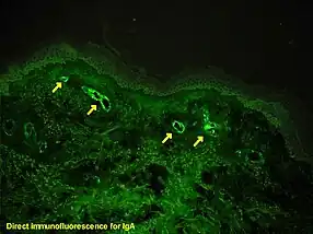 If there is doubt about the cause of the skin lesions, a biopsy of the skin may be performed to distinguish the purpura from other diseases that cause it, such as vasculitis due to cryoglobulinemia; on microscopy the appearances are of a hypersensitivity vasculitis, and immunofluorescence demonstrates IgA and C3 (a protein of the complement system) in the blood vessel wall.[4] However, overall serum complement levels are normal.