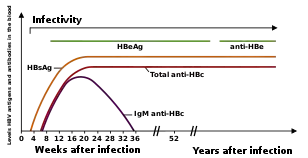 Shortly after the appearance of the HBsAg, another antigen called hepatitis B e antigen (HBeAg) will appear. Traditionally, the presence of HBeAg in a host's serum is associated with much higher rates of viral replication and enhanced infectivity; however, variants of the hepatitis B virus do not produce the 'e' antigen, so this rule does not always hold true.[59] During the natural course of an infection, the HBeAg may be cleared, and antibodies to the 'e' antigen (anti-HBe) will arise immediately afterwards. This conversion is usually associated with a dramatic decline in viral replication.
