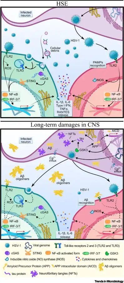 - ↑ Marcocci, Maria Elena; Napoletani, Giorgia; Protto, Virginia; Kolesova, Olga; Piacentini, Roberto; Li Puma, Domenica Donatella; Lomonte, Patrick; Grassi, Claudio; Palamara, Anna Teresa; De Chiara, Giovanna (October 2020). "Herpes Simplex Virus-1 in the Brain: The Dark Side of a Sneaky Infection". Trends in Microbiology. 28 (10): 808–820. doi:10.1016/j.tim.2020.03.003.