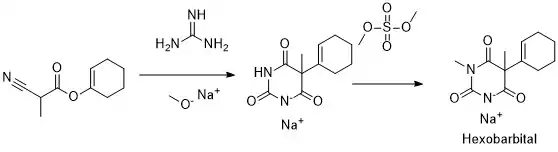 Hexobarbital can be synthesized by reacting cyclohex-1-enyl 2-cyanopropanoate with guanidine and sodium methylate. A hexobarbital sodium intermediate is then formed which can be methylated with dimethyl sulfate.[9]