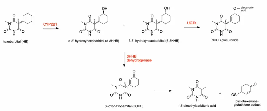 - ↑ Takenoshita R, Nakamura T, Toki S (August 1993). "Hexobarbital metabolism: a new metabolic pathway to produce 1,5-dimethylbarbituric acid and cyclohexenone-glutathione adduct via 3'-oxohexobarbital". Xenobiotica; the Fate of Foreign Compounds in Biological Systems. 23 (8): 925–34. doi:10.3109/00498259309059419. PMID 8284947.