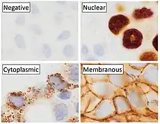 Many proteins shown to be highly upregulated in pathological states by immunohistochemistry are potential targets for therapies utilising monoclonal antibodies. Monoclonal antibodies, due to their size, are utilized against cell surface targets. Among the overexpressed targets are members of the EGFR family, transmembrane proteins with an extracellular receptor domain regulating an intracellular tyrosine kinase.[20] Of these, HER2/neu (also known as Erb-B2) was the first to be developed. The molecule is highly expressed in a variety of cancer cell types, most notably breast cancer. As such, antibodies against HER2/neu have been FDA approved for clinical treatment of cancer under the drug name Herceptin. There are commercially available immunohistochemical tests, Dako HercepTest, Leica Biosystems Oracle[21] and Ventana Pathway.[22]
