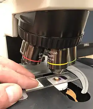 For light microscopy, a knife mounted in a microtome is used to cut tissue sections (typically between 5-15 micrometers thick) which are mounted on a glass microscope slide.[9] For transmission electron microscopy (TEM), a diamond or glass knife mounted in an ultramicrotome is used to cut between 50 and 150 nanometer thick tissue sections.[9]