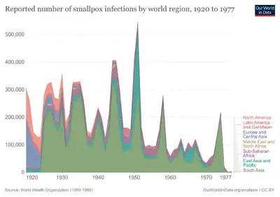 During the colonial period, smallpox remained a scourge, especially on the indigenous population. There was a major epidemic between 1790 and 1791 that started in Valley of Mexico,[7] principally affecting children.[8] More people recovered than died. In Mexico City, of 5400 cases admitted to the hospital, 4431 recovered and 1,331 died. This epidemic coincided with the rise of prices of corn and a typhus epidemic, which caused a slight demographic decrease in central Mexico.[8]
