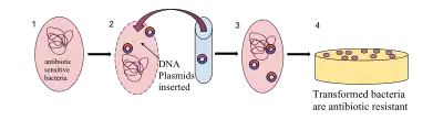 Before it is transformed, a bacterium is susceptible to antibiotics. A plasmid can be inserted when the bacteria is under stress, and be incorporated into the bacterial DNA creating antibiotic resistance. When the plasmids are prepared they are inserted into the bacterial cell by either making pores in the plasma membrane with temperature extremes and chemical treatments, or making it semi permeable through the process of electrophoresis, in which electric currents create the holes in the membrane. After conditions return to normal the holes in the membrane close and the plasmids are trapped inside the bacteria where they become part of the genetic material and their genes are expressed by the bacteria.
