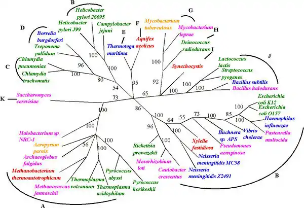 - ↑ Woese C, et al. (1990). "Towards a natural system of organisms: proposal for the domains Archaea, Bacteria, and Eucarya". PNAS USA. 87 (12): 4576–9. Bibcode:1990PNAS...87.4576W. doi:10.1073/pnas.87.12.4576. PMC 54159. PMID 2112744.