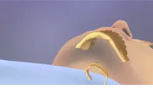 In hyo-mandibular suspension, sutures are looped around the anterior section of the hyoid bone, the hyoid is advanced typically 2–3 centimeters (until the muscle attachments to the hyoid are tensioned) using the sutures, and the hyoid advancement is locked into place and secured via bone anchors on the front lower inside portion of the jaw. This procedure is typically performed with two incisions, one incision under the chin for placement of bone anchors into the jaw and one incision directly over the hyoid bone for the most direct access to the bone. Some surgeons perform the procedure from only the single incision below the chin. Potential complications and side effects from the procedure include neck seromas, edema, and surgical site infection.