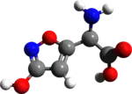 Ibotenic acid or (S)-2-amino-2-(3-hydroxyisoxazol-5-yl)acetic acid, also referred to as ibotenate, is a chemical compound and psychoactive drug which occurs naturally in Amanita muscaria and related species of mushrooms typically found in the temperate and boreal regions of the northern hemisphere. It is a prodrug of muscimol, broken down by the liver to that much more stable compound.[2] It is a conformationally-restricted analogue of the neurotransmitter glutamate, and due to its structural similarity to this neurotransmitter, acts as a non-selective glutamate receptor agonist.[3] Because of this, ibotenic acid can be a powerful neurotoxin in high doses, and is employed as a "brain-lesioning agent" through cranial injections in scientific research.[4][5] The neurotoxic effects appear to be dose-related and risks are unclear through consumption of ibotenic-acid containing fungi, although thought to be negligible in small doses.[6]