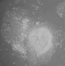 Human iPS cells colonies. The spindle-shaped cells in the background are mouse fibroblast cells. Only those cells comprising the center colony are human iPS cells.
