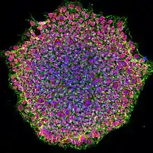 Confocal microscopic image of a colony of human induced pluripotent stem cells derived from a patient with oculocutaneous albinism. Red indicates transcription factor Oct-4, green the protein SSEA4, and blue the nuclei of the cells.