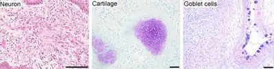 Three germ line cells/tissues differentiated from iPSCs: neurons (ectoderm), cartilage (soft bone, mesoderm) and goblet cells in intestine (endoderm).