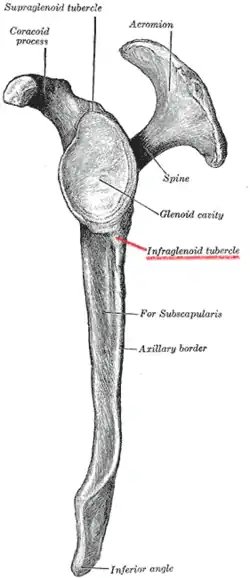 ![]() Lateral view of left scapula (infraglenoid tubercle labeled at center right) | |