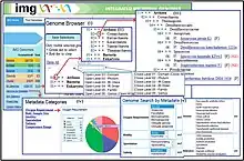The Integrated Microbial Genomes (IMG) system is a genome browsing and annotation platform developed by the U.S. Department of Energy (DOE)-Joint Genome Institute.[2][3] IMG contains all the draft and complete microbial genomes sequenced by the DOE-JGI integrated with other publicly available genomes (including Archaea, Bacteria, Eukarya, Viruses and Plasmids). IMG provides users a set of tools for comparative analysis of microbial genomes along three dimensions: genes, genomes and functions. Users can select and transfer them in the comparative analysis carts based upon a variety of criteria. IMG also includes a genome annotation pipeline that integrates information from several tools, including KEGG, Pfam, InterPro, and the Gene Ontology, among others. Users can also type or upload their own gene annotations (called MyIMG gene annotations) and the IMG system will allow them to generate Genbank or EMBL format files containing these annotations.