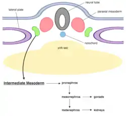 Intermediate mesoderm or intermediate mesenchyme is a narrow section of the mesoderm (one of the three primary germ layers) located between the paraxial mesoderm and the lateral plate of the developing embryo.[1] The intermediate mesoderm develops into vital parts of the urogenital system (kidneys, gonads and respective tracts).