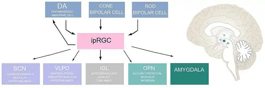 - 1 2 3 4 5 Kolb H, Fernandez E, Nelson R (1995-01-01). "Melanopsin-expressing, Intrinsically Photosensitive Retinal Ganglion Cells (IpRGCs)". In Kolb H, Fernandez E, Nelson R (eds.). Webvision: The Organization of the Retina and Visual System. University of Utah Health Sciences Center. PMID 21413389.
