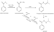 There are multiple routes to synthesize iproniazid. The most common precursor is methyl isonicotinate which formes isonicotinohydrazide when it reacts with hydrazine.[13] Isonicotinohydrazide can be converted into iproniazid via different pathways.