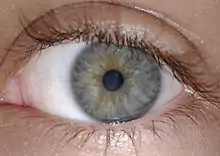 Heterochromia (also known as a heterochromia iridis or heterochromia iridum) is an ocular condition in which one iris is a different color from the other iris (complete heterochromia), or where the part of one iris is a different color from the remainder (partial heterochromia or sectoral heterochromia). Uncommon in humans, it is often an indicator of ocular disease, such as chronic iritis or diffuse iris melanoma, but may also occur as a normal variant. Sectors or patches of strikingly different colors in the same iris are less common. Anastasius the First was dubbed dikoros (having two irises) for his patent heterochromia since his right iris had a darker color than the left one.[9][10]